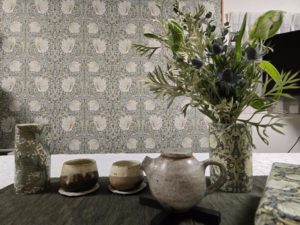 サンプルを取り寄せて現場で色合わせを行い、最終的にピンパーネル柄のアクセントクロスを採用。施工後には同じモリスの花器も加わり、統一感のある上質な空間が完成しました。
