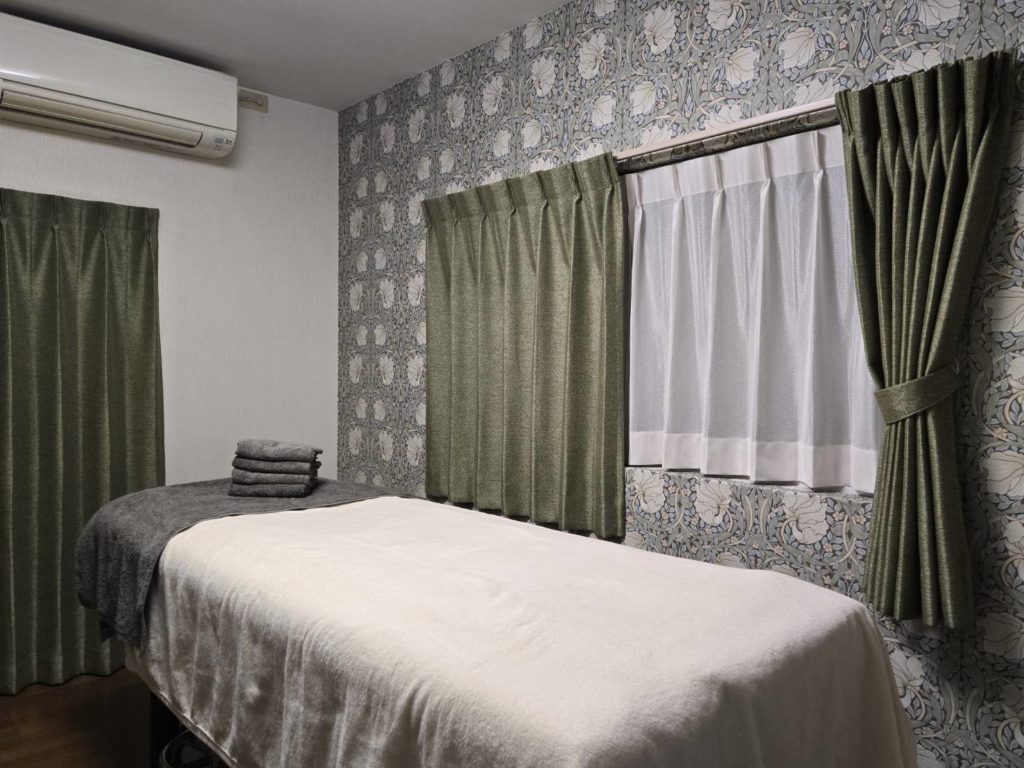 巽の氣は「風・調和・優しさ」。その性質をより活かすため、落ち着きのある 深いグリーンのカーテン を採用し、空間に柔らかさと奥行きをプラスしています。