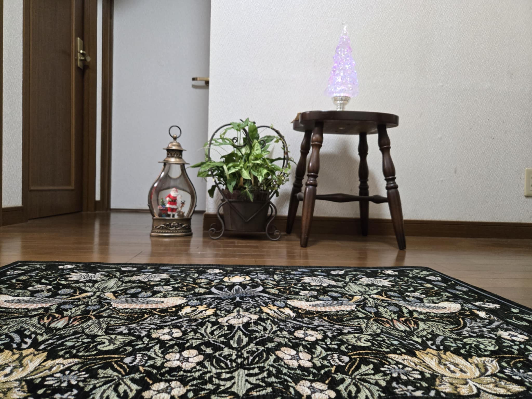 玄関は風水上、不調が出やすい北西方位。鑑定では “水性のもので化殺をする” と出たため、黒の玄関マットとガラスのオブジェ、そしてモリスの「いちご泥棒」を組み合わせて凶作用を和らげました。