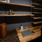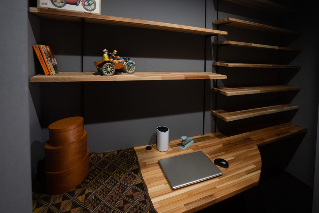 棚には積層板を採用し、あえて木目を見せることで、黒一色になりすぎない自然なバランスを演出しました。